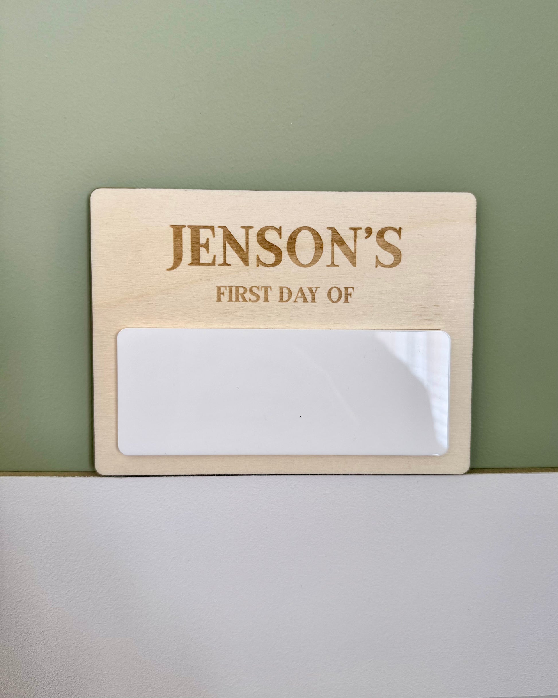 Crafted from engraved natural wood, this plaque features your childâs name at the top, followed by the words âFirst Day Ofâ and a white acrylic dry-wipe section belowâperfect for writing the date, school year, or even what they want to be when they grow up.