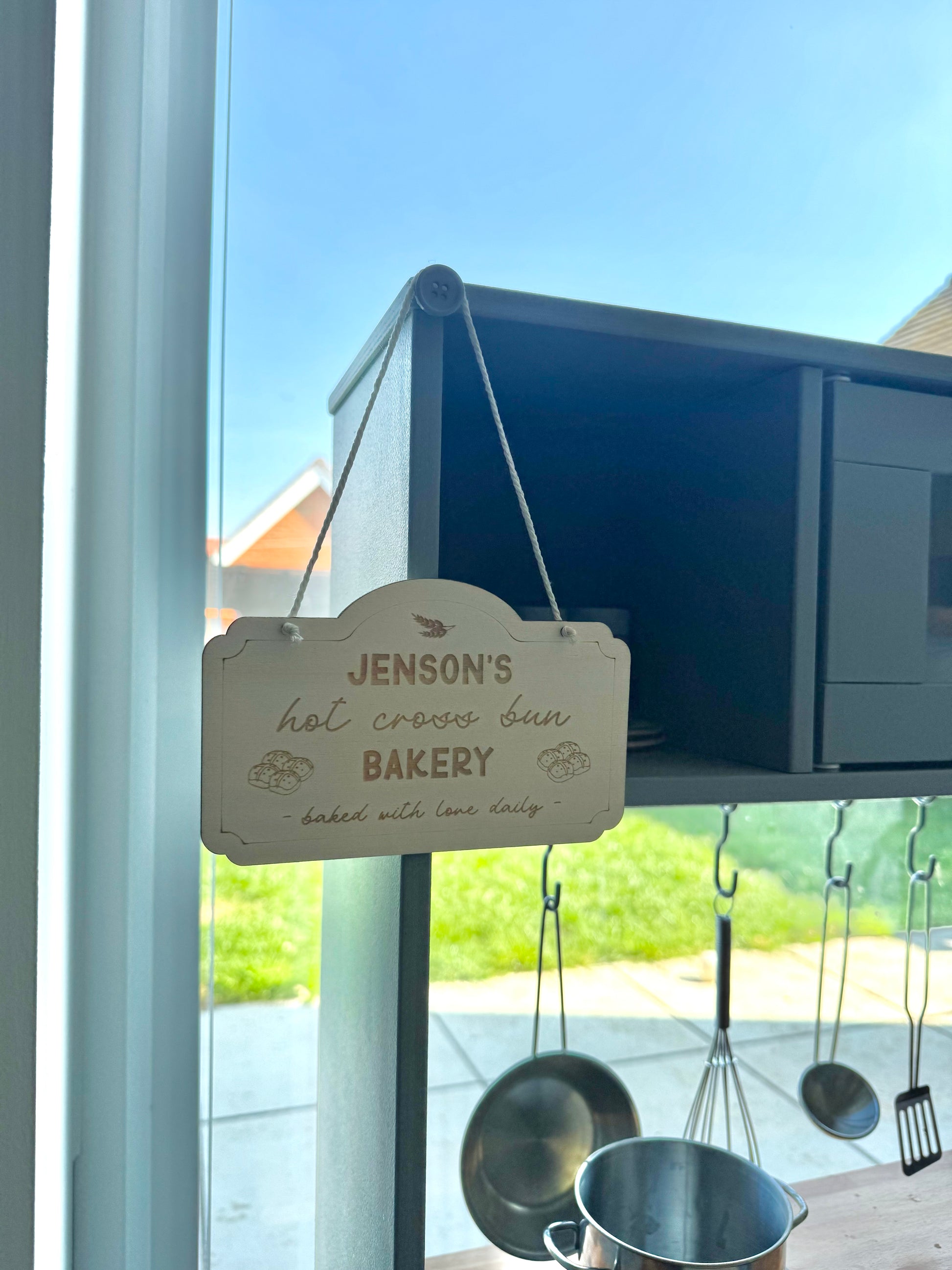 Bring a sprinkle of Easter charm to your little one’s play kitchen with our Personalised Hot Cross Bun Bakery Sign! Featuring a cute engraved design, this wooden sign adds the perfect seasonal touch for your child’s imaginative play. Personalise it with a name to create their very own mini bakery, ready to whip up pretend hot cross buns all season long!