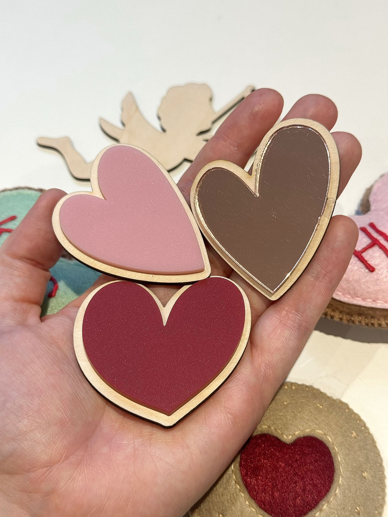 Set of 3 heart wall shapes, wood backing with acrylic. Each set will come with one heart in Ruby, one in Blossom & one in Rose Gold Mirror.