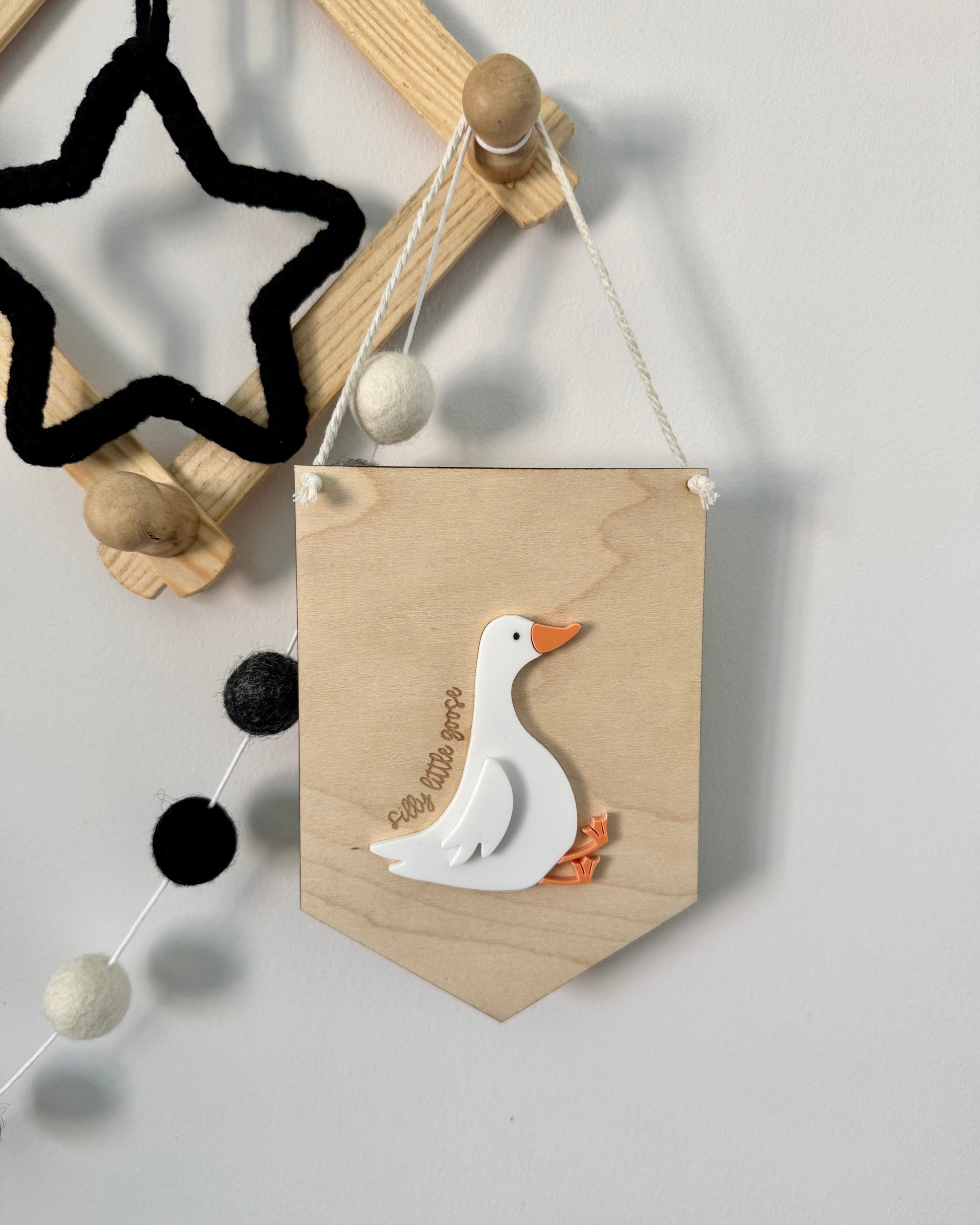 Add a playful twist to your little one’s space with our Silly Little Goose Mini Pennant! Featuring a sweet white goose with orange beak and feet, layered in glossy acrylic on a smooth wooden pennant, this piece is as charming as it is cheeky.